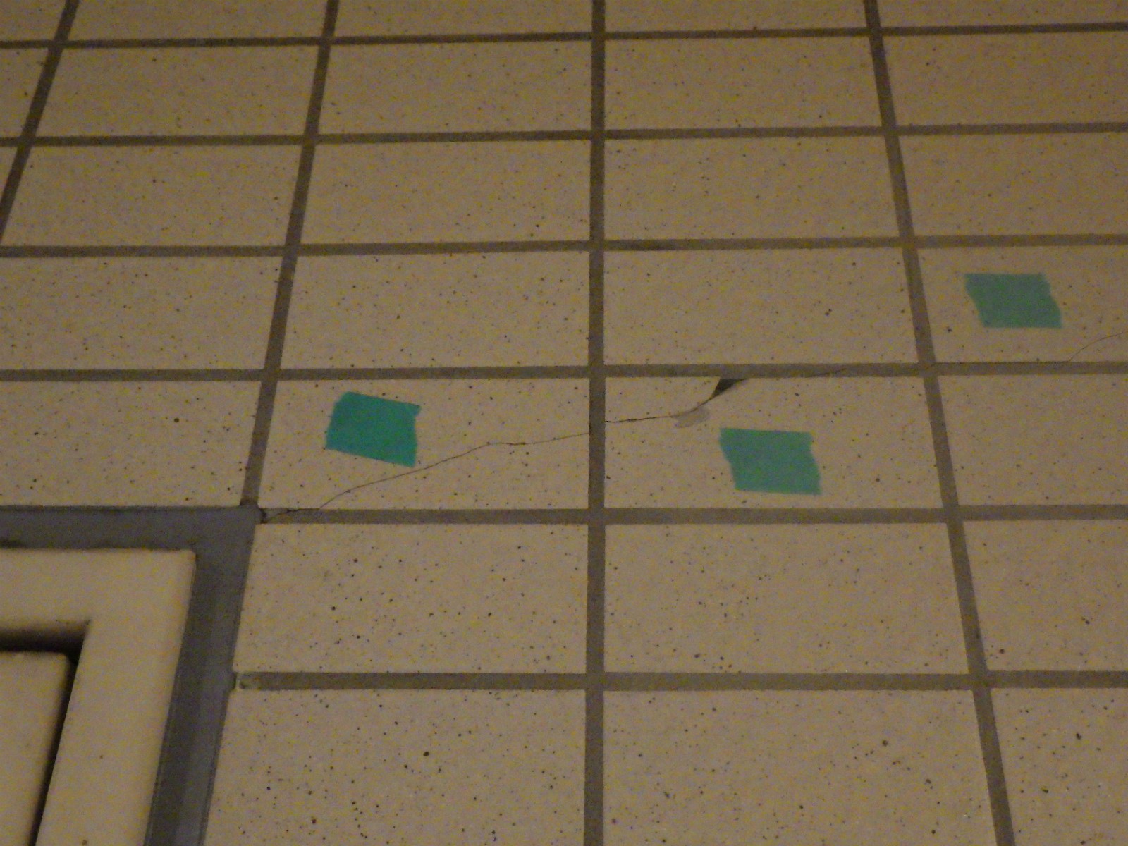 打診棒(先に玉がついた棒)を転がしタイル面や塗装面の浮きを調査する打診調査(打診検査)や目視等で補修が必要な箇所を調査し、マーキングを行います。