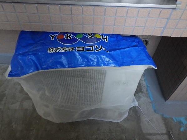 室外機にメッシュ素材の養生カバー(写真参照)をいたしますが、エアコンの使用に問題はありません。